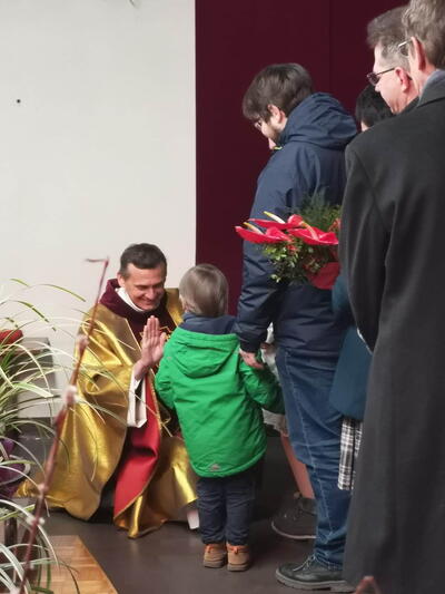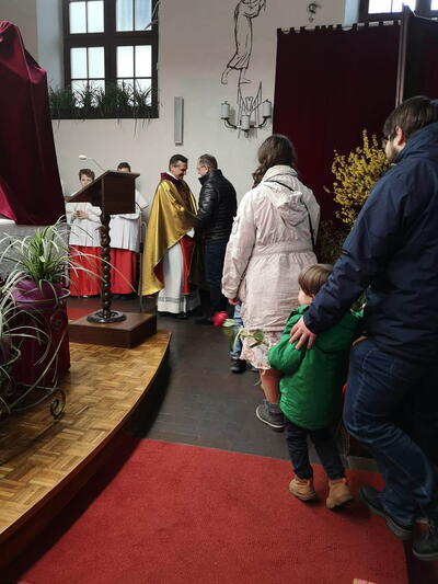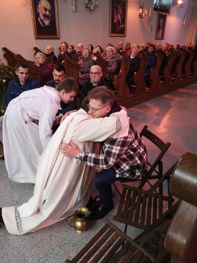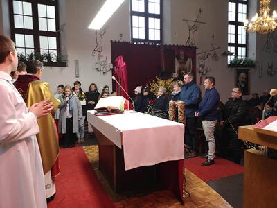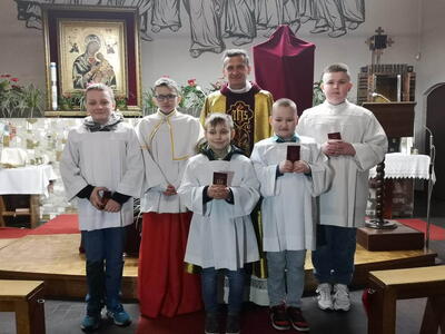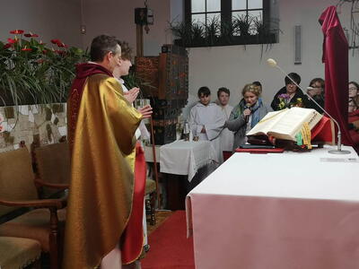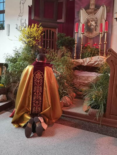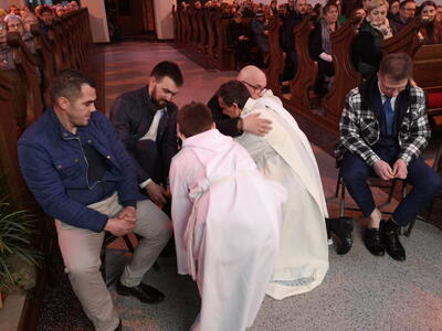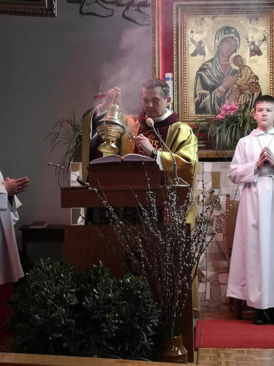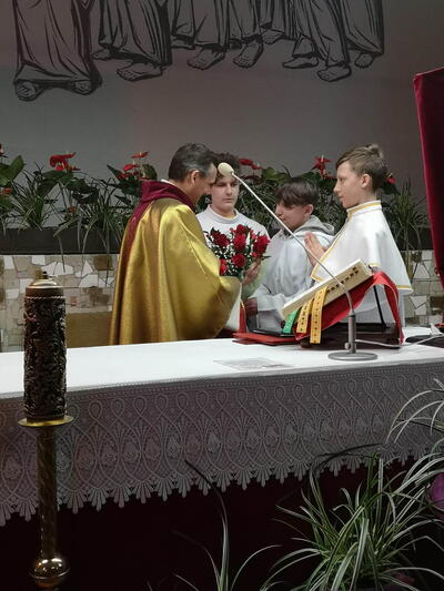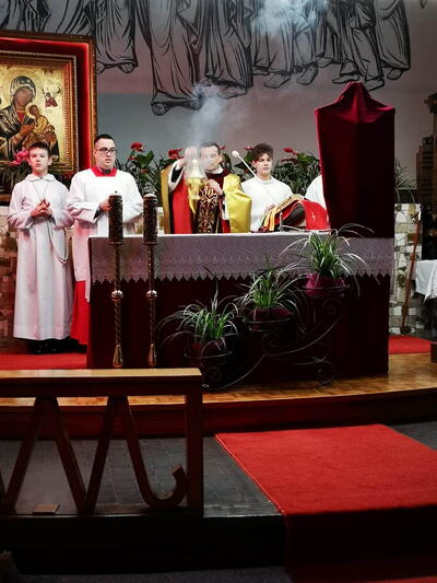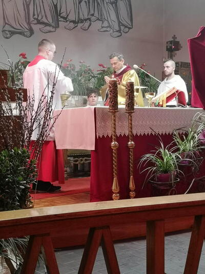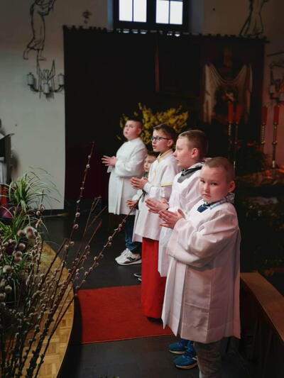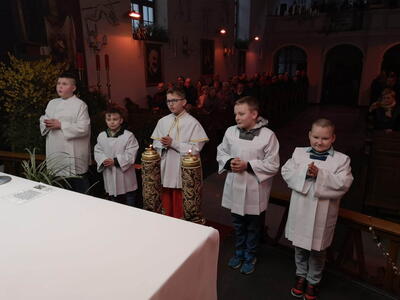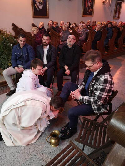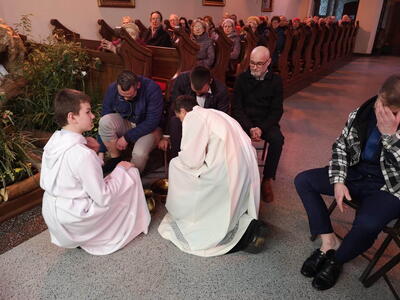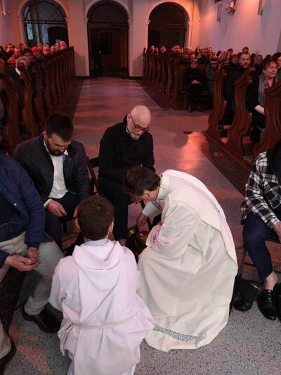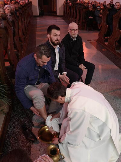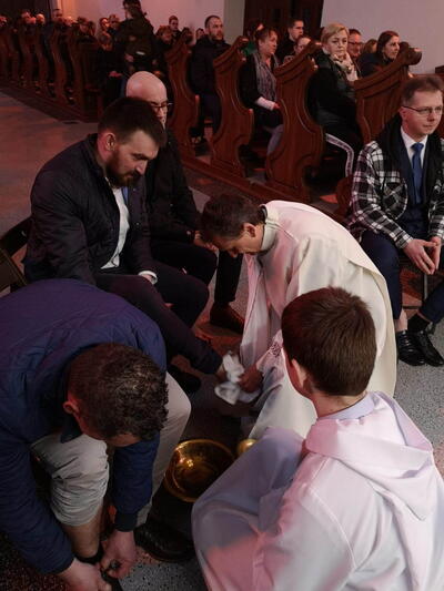„Gdy Pan wstał od wieczerzy, nalał wody w miednicę...”, to pierwsze słowa pieśni przewidzianej na obrzęd obmycia nóg, który w Wielki Czwartek jest jednym z najważniejszych znaków w liturgii. W pierwszy dzień Triduum Paschalnego dziękujemy Bogu za sakrament Eucharystii oraz Kapłaństwa, tradycją naszej parafii jest przyjęcie w tym dniu do grona Służby Liturgicznej nowych ministrantów. Na zakończenie Mszy Wieczerzy Pańskiej Najświętszy Sakrament zostaje przeniesiony do ciemnicy.