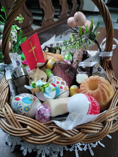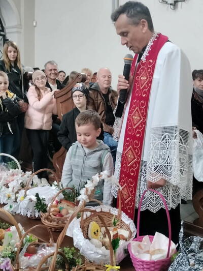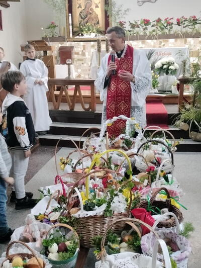 W Wielką Sobotę odbyło się tradycyjne święcenie pokarmów. Wierni, całymi rodzinami, przychodzili do kościoła ze świątecznymi koszyczkami, w których znalazły się chleb, jajka, wędlina i inne symbole życia oraz radości ze Zmartwychwstania. Ksiądz Proboszcz błogosławił pokarmy, przypominając o ich duchowym znaczeniu i zachęcając do przeżywania świąt w jedności z Chrystusem. Atmosfera była pełna radości i nadziei, a wspólne spotkanie przy ołtarzu jeszcze mocniej zjednoczyło parafialną wspólnotę w oczekiwaniu na Wigilię Paschalną.