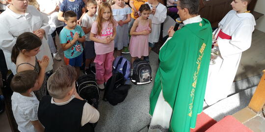 W niedzielę 10 września podczas Mszy Świętej o godz. 12:00 Ksiądz Proboszcz dokonał poświecenia tornistrów i plecaków dzieciom, które rozpoczęły nowy rok szkolny. Życzymy dzieciom błogosławieństw Bożego oraz wielu sukcesów naukowych podczas całego roku.