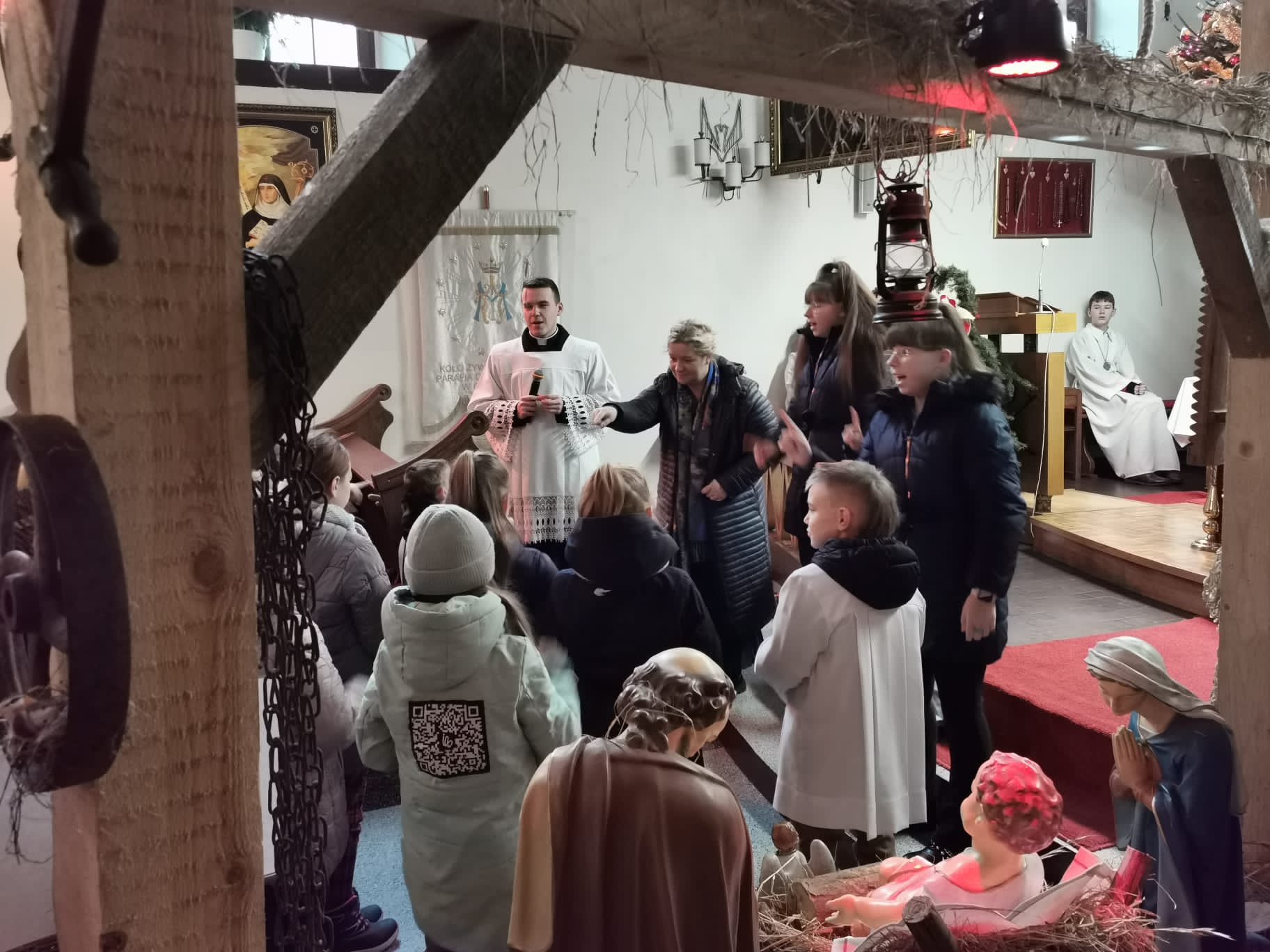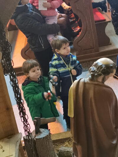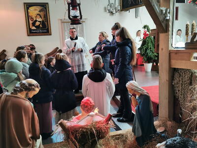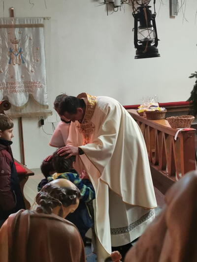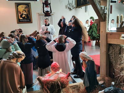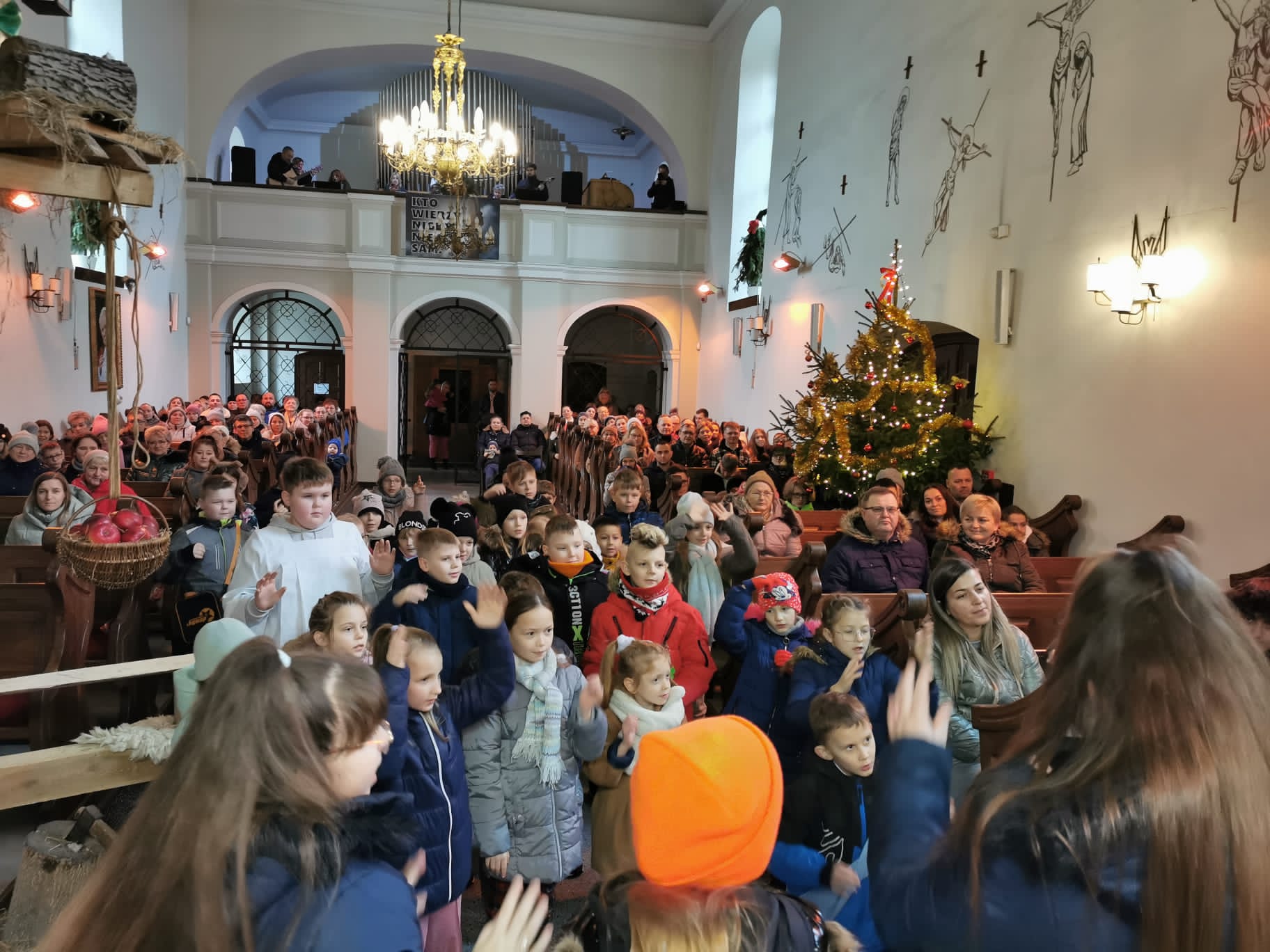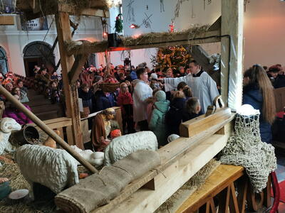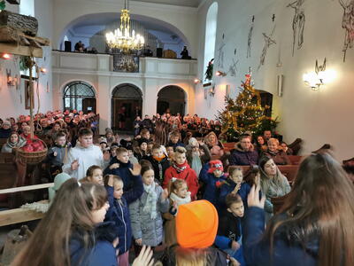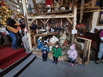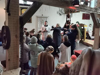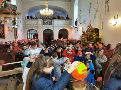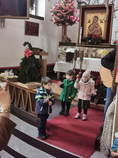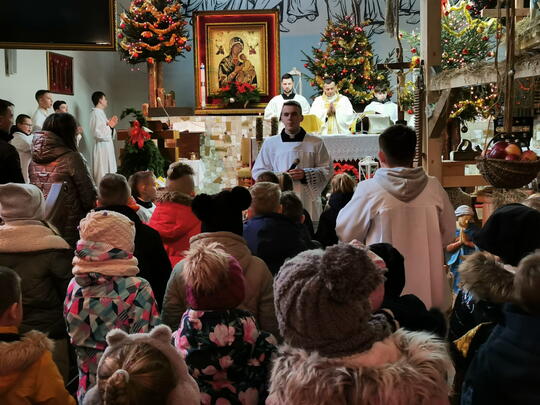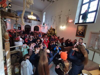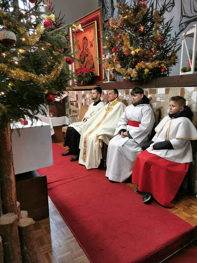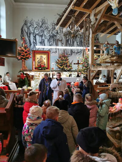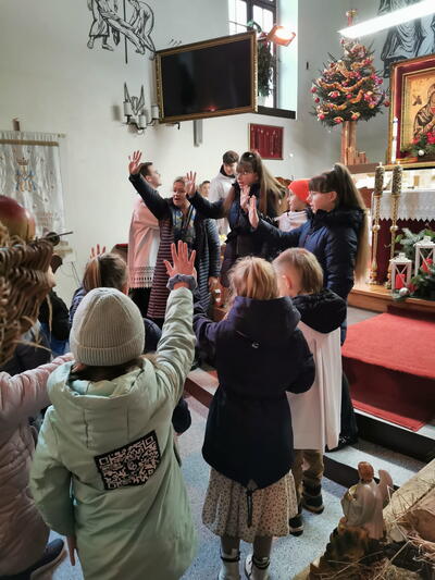 W ostatnią niedzielę grudnia - 31.12.2023 obchodziliśmy Święto Świętej Rodziny, podczas Mszy Świętej o godz. 12:00 zgromadzone dzieci nauczyły się nowej piosenki pt.„Wołek i osiołek”, z pokazywaniem. Nasz parafialny zespół jak zwykle stanął na wysokości zadania i przygotował wspaniałą piosenkę. Podczas nauki piosenki poszczególne elementy wyjaśniał dzieciom kleryk Radosław.