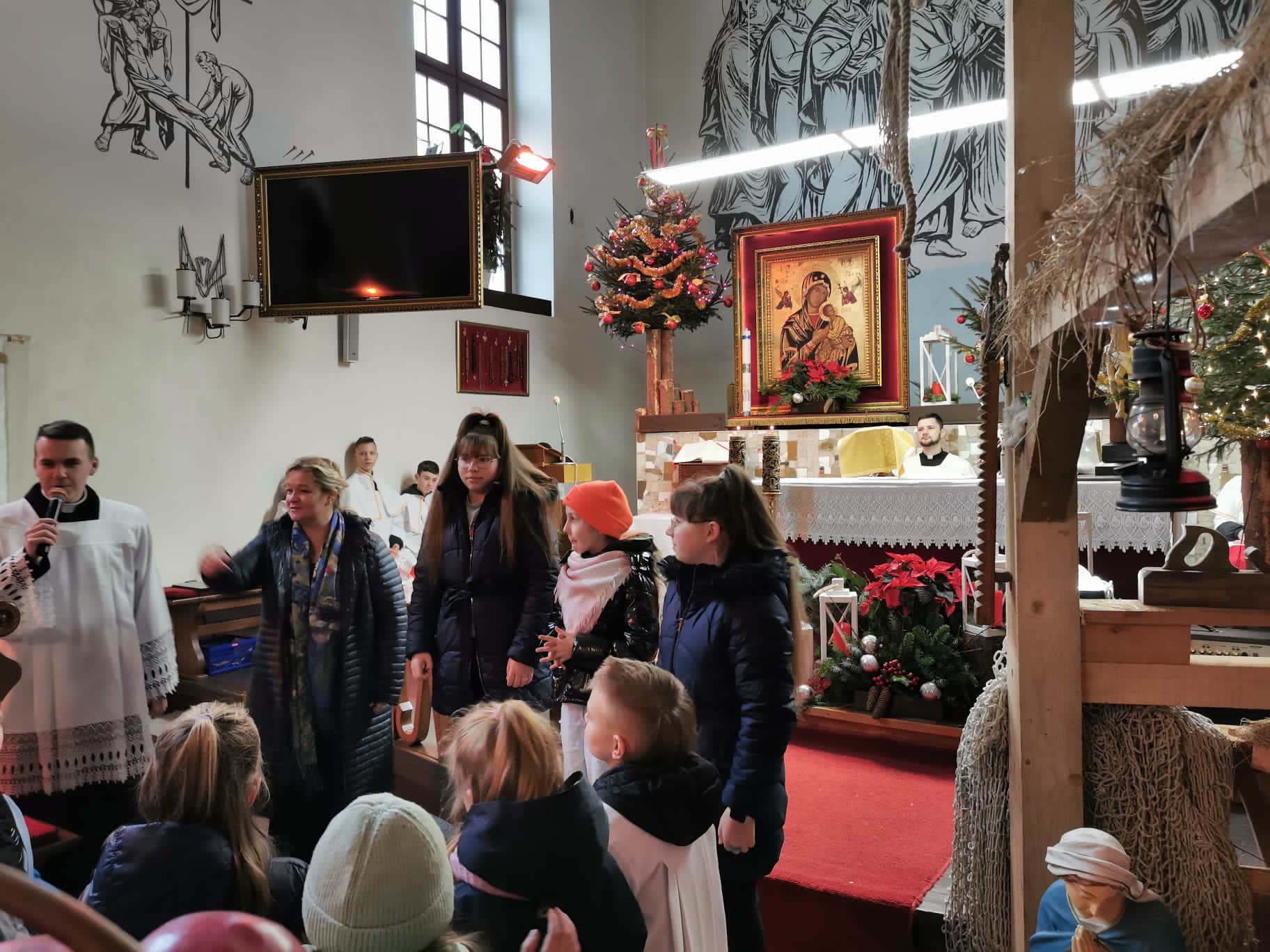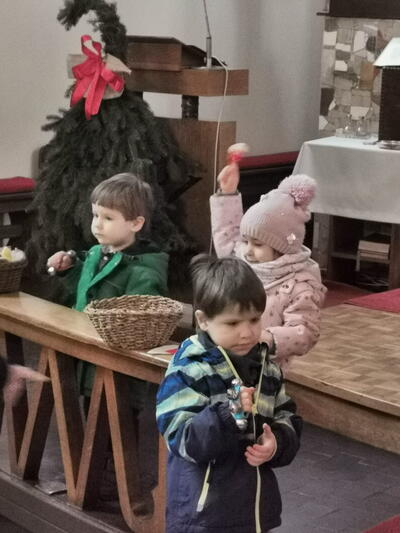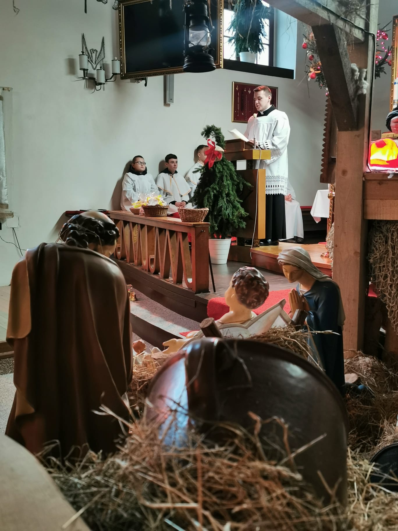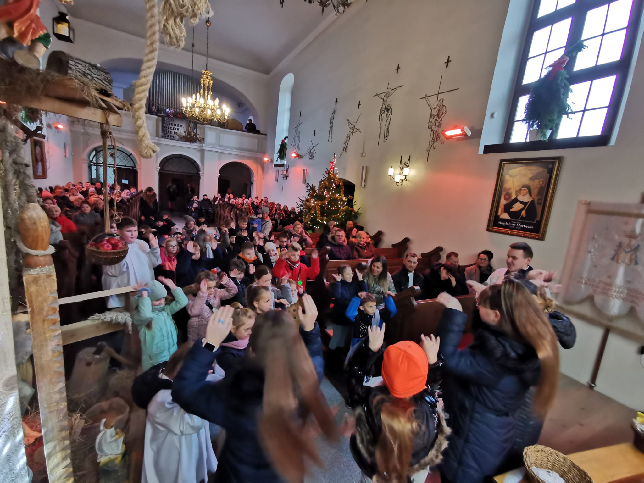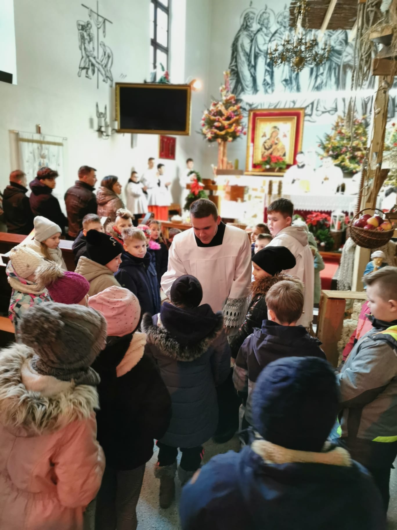 W ostatnią niedzielę grudnia - 31.12.2023 obchodziliśmy Święto Świętej Rodziny, podczas Mszy Świętej o godz. 12:00 zgromadzone dzieci nauczyły się nowej piosenki pt.„Wołek i osiołek”, z pokazywaniem. Nasz parafialny zespół jak zwykle stanął na wysokości zadania i przygotował wspaniałą piosenkę. Podczas nauki piosenki poszczególne elementy wyjaśniał dzieciom kleryk Radosław.