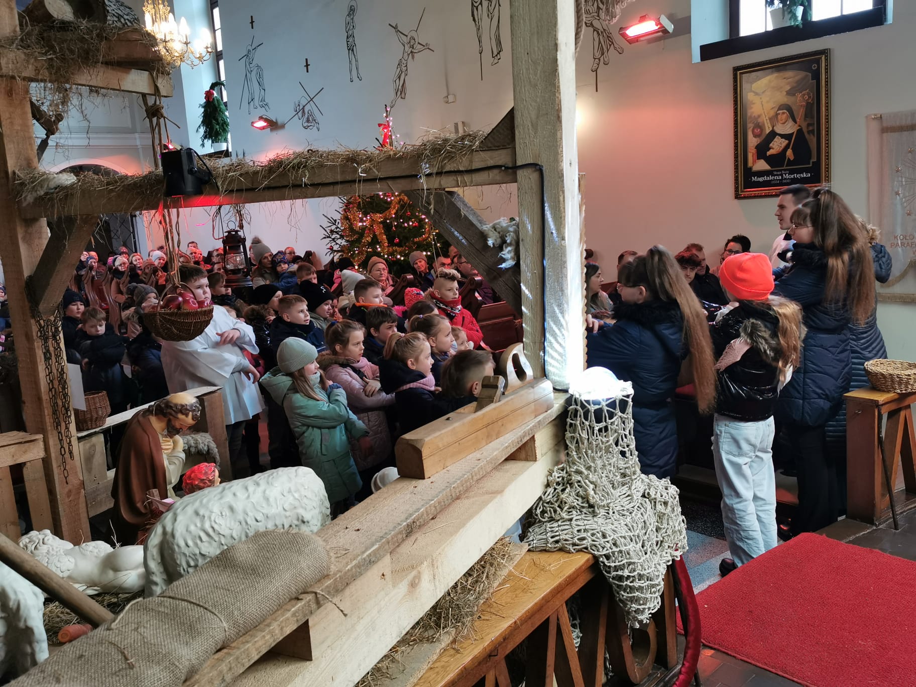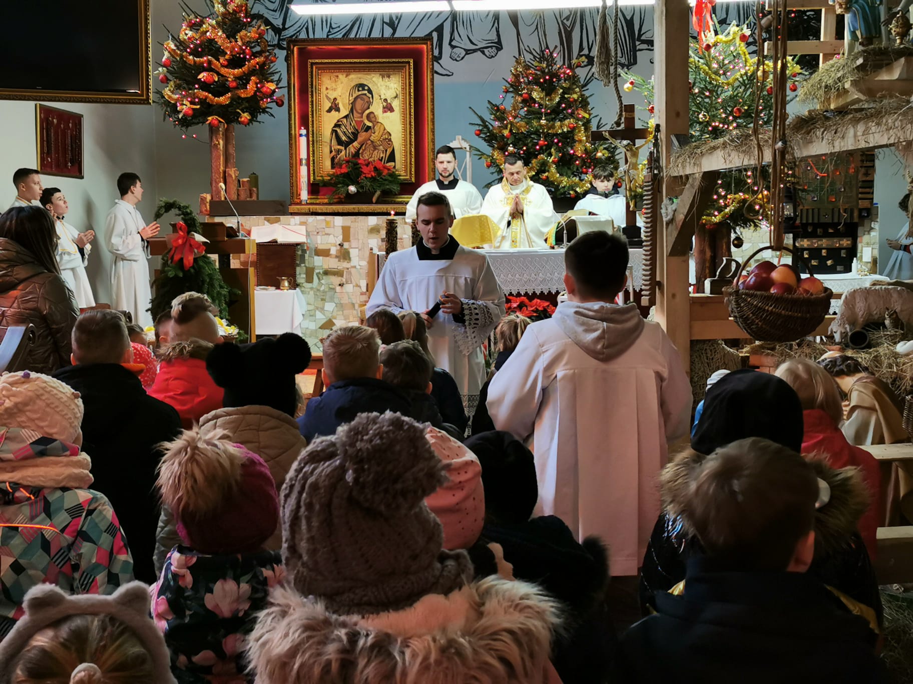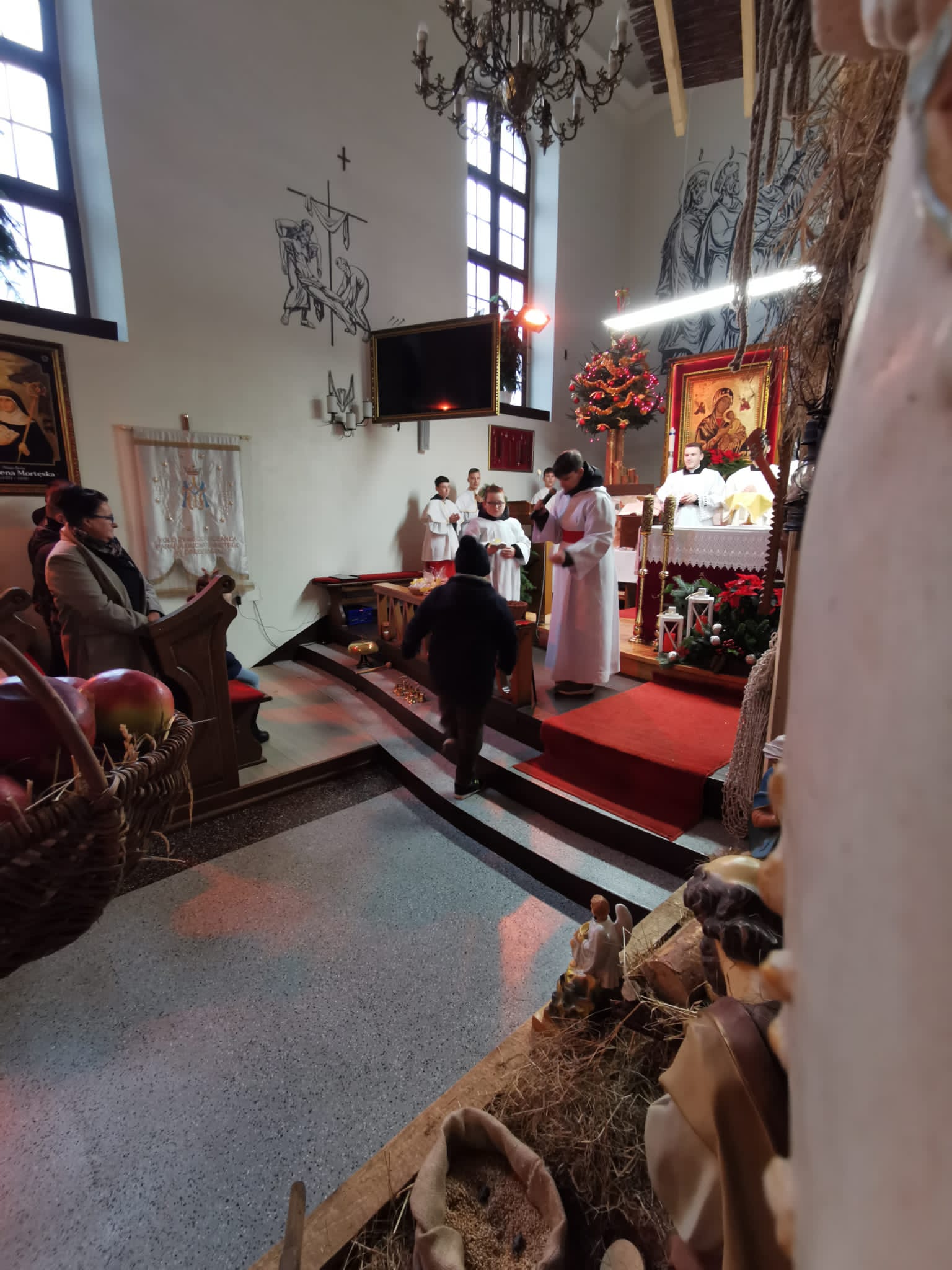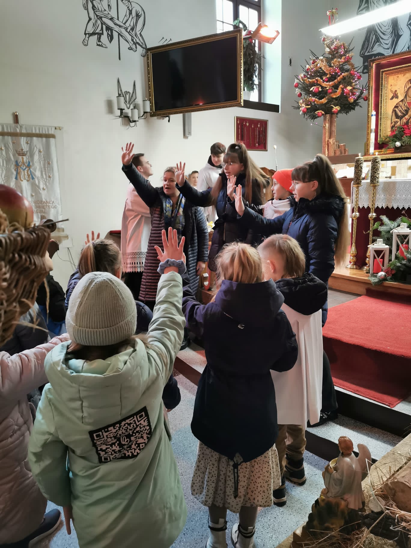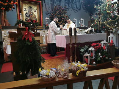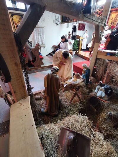 W ostatnią niedzielę grudnia - 31.12.2023 obchodziliśmy Święto Świętej Rodziny, podczas Mszy Świętej o godz. 12:00 zgromadzone dzieci nauczyły się nowej piosenki pt.„Wołek i osiołek”, z pokazywaniem. Nasz parafialny zespół jak zwykle stanął na wysokości zadania i przygotował wspaniałą piosenkę. Podczas nauki piosenki poszczególne elementy wyjaśniał dzieciom kleryk Radosław.