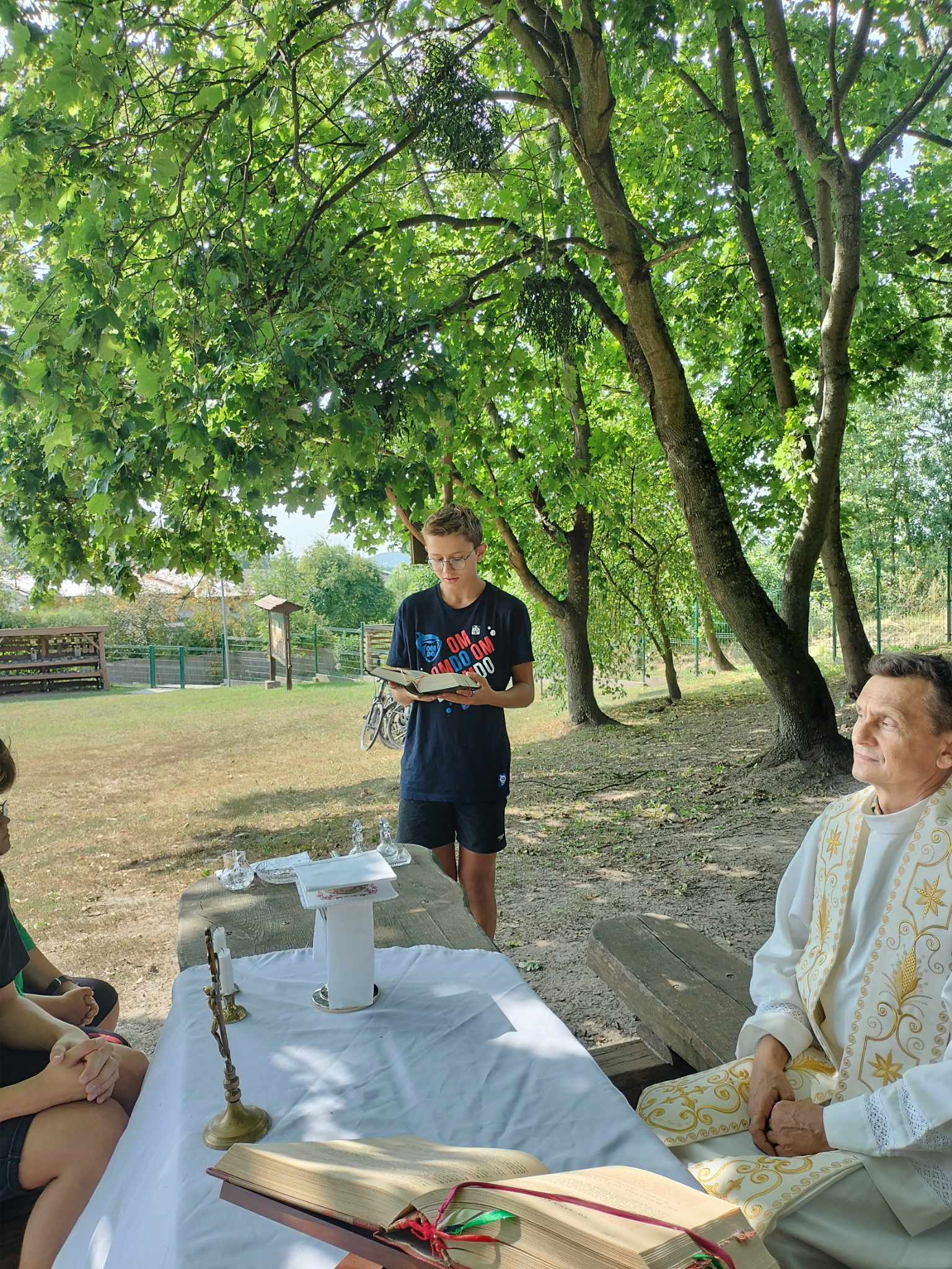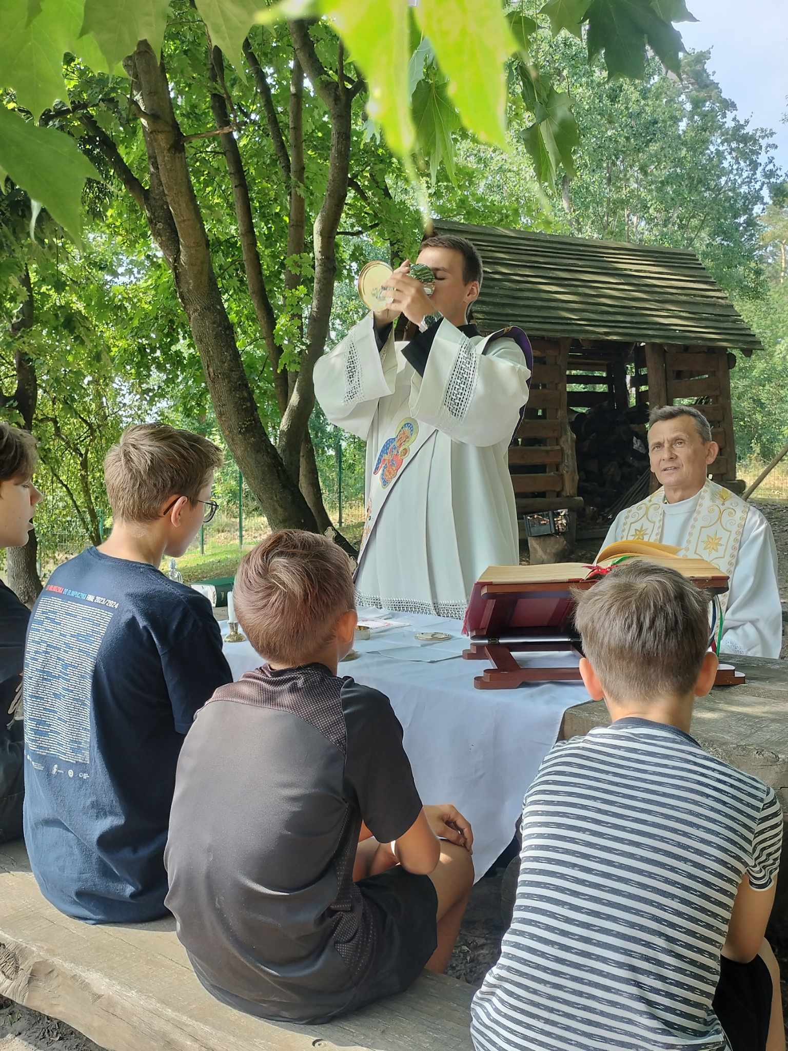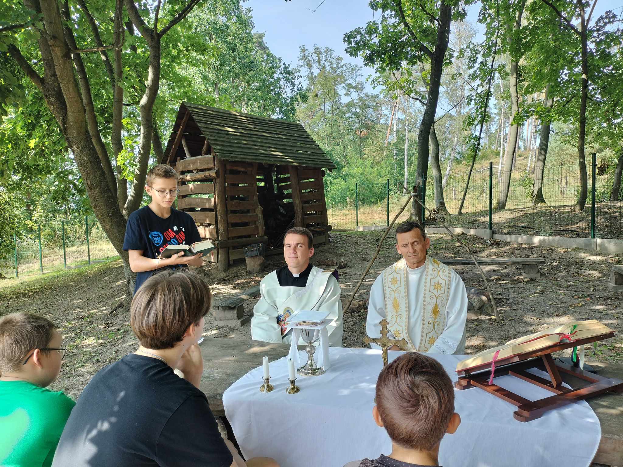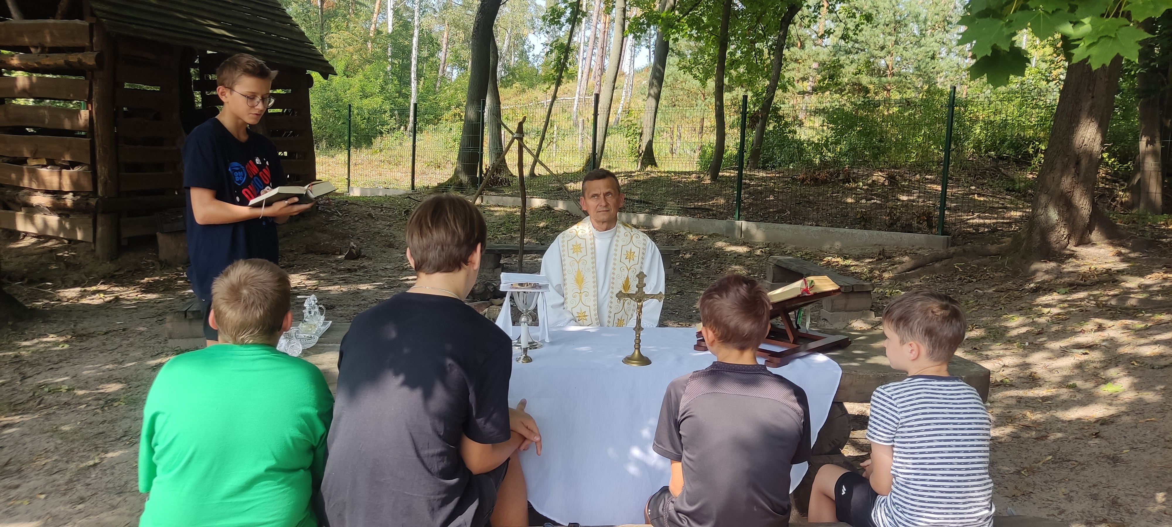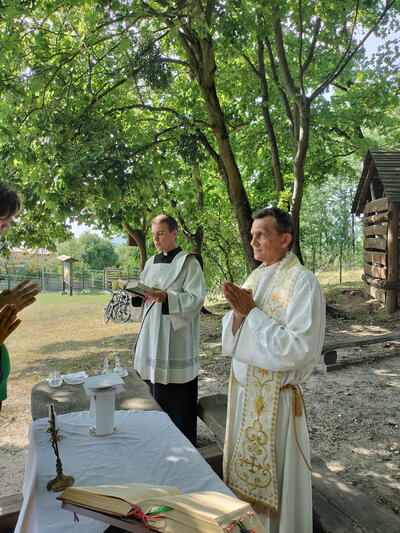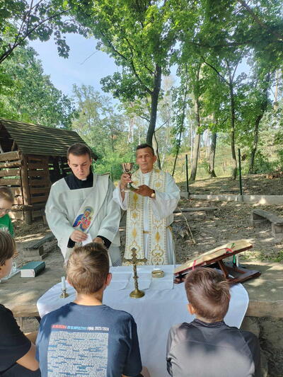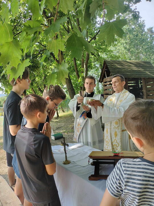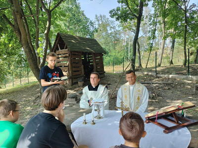 Wtorek 22 sierpnia był wyjątkowy dla naszych ministrantów. Tego dnia odbyła się wycieczka rowerowa po pięknym terenie nadleśnictwa Jamy. Grupa ministrantów wraz z Księdzem Proboszczem dotarła do domu Ludwika Rydygiera, niestety posiadłość okazała się niedostępna dla zwiedzających. Kolejno rowerzyści udali się na leśną ścieżkę edukacyjną w Białochowie. Tam spotkali się z drugą grupą ministrantów, którzy dotarli na miejsce z dk. Radkiem. Po zwiedzaniu ścieżki edukacyjnej, przyszedł czas na najważniejszy punkt wycieczki - Eucharystię, sprawowaną na wolnym powietrzu. Po uczcie dla ducha, było coś dla ciała. Pieczenie kiełbasek oraz wspólne integracja i zabawy. Ten dzień zapadnie na długo w naszej pamięci.