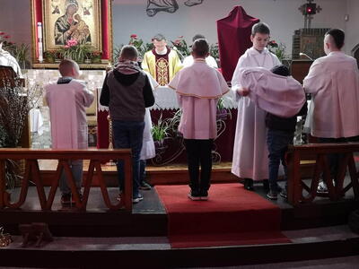 „Gdy Pan wstał od wieczerzy, nalał wody w miednicę...”, to pierwsze słowa pieśni przewidzianej na obrzęd obmycia nóg, który w Wielki Czwartek jest jednym z najważniejszych znaków w liturgii. W pierwszy dzień Triduum Paschalnego dziękujemy Bogu za sakrament Eucharystii oraz Kapłaństwa, tradycją naszej parafii jest przyjęcie w tym dniu do grona Służby Liturgicznej nowych ministrantów. Na zakończenie Mszy Wieczerzy Pańskiej Najświętszy Sakrament zostaje przeniesiony do ciemnicy.