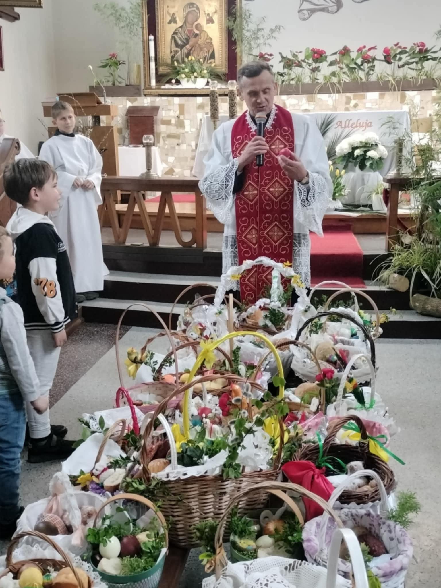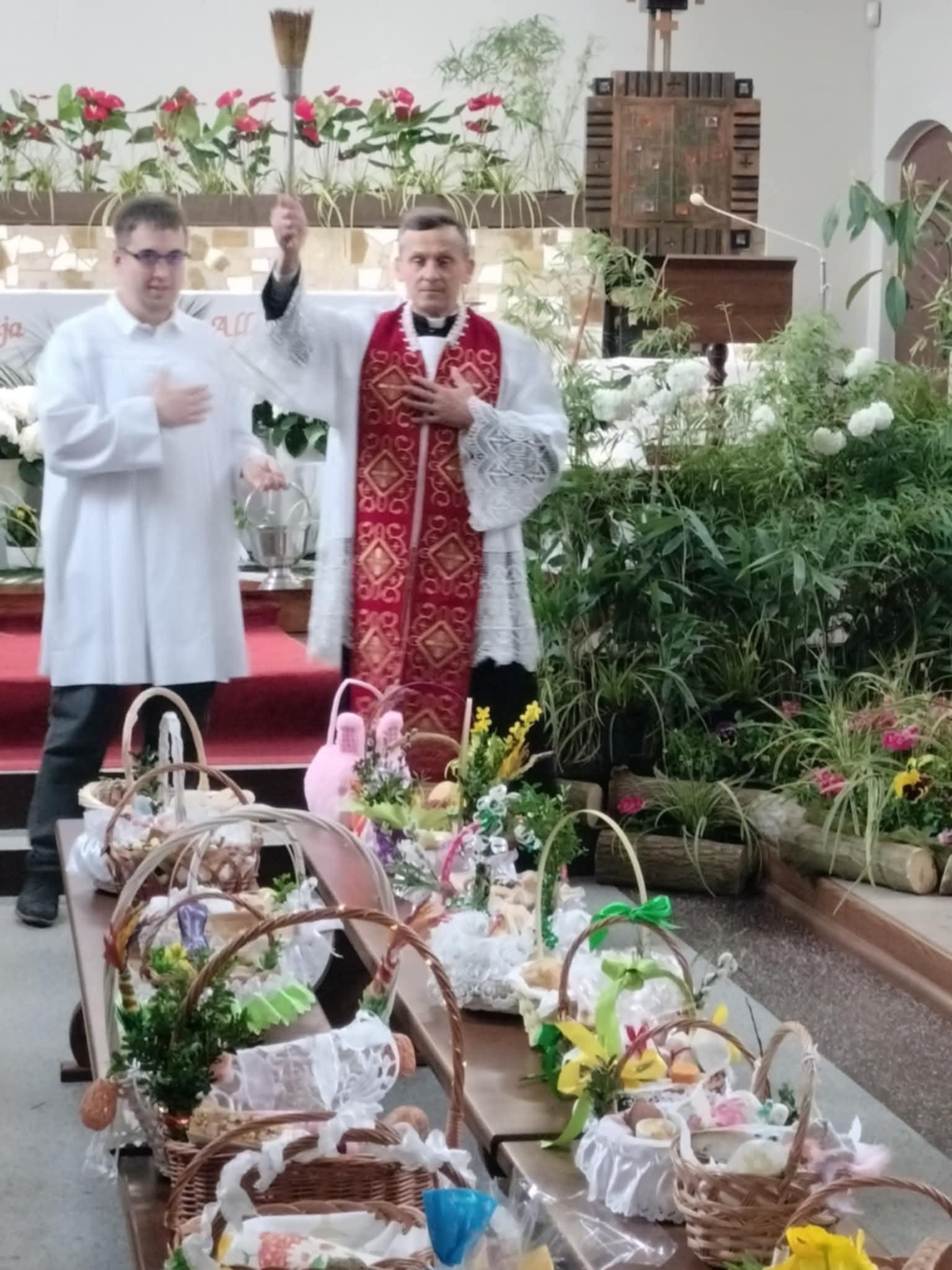 W Wielką Sobotę odbyło się tradycyjne święcenie pokarmów. Wierni, całymi rodzinami, przychodzili do kościoła ze świątecznymi koszyczkami, w których znalazły się chleb, jajka, wędlina i inne symbole życia oraz radości ze Zmartwychwstania. Ksiądz Proboszcz błogosławił pokarmy, przypominając o ich duchowym znaczeniu i zachęcając do przeżywania świąt w jedności z Chrystusem. Atmosfera była pełna radości i nadziei, a wspólne spotkanie przy ołtarzu jeszcze mocniej zjednoczyło parafialną wspólnotę w oczekiwaniu na Wigilię Paschalną.