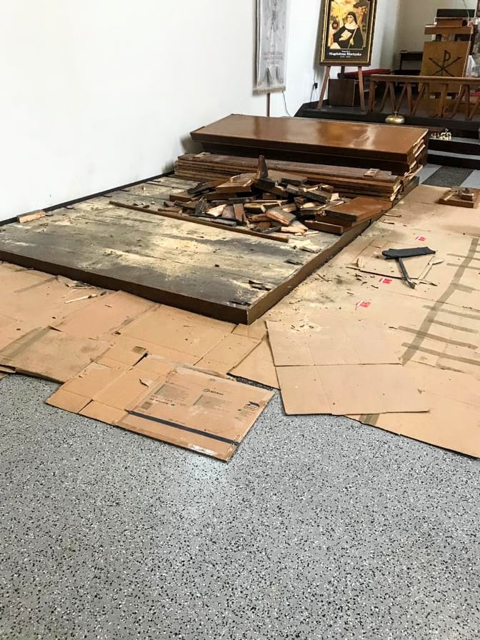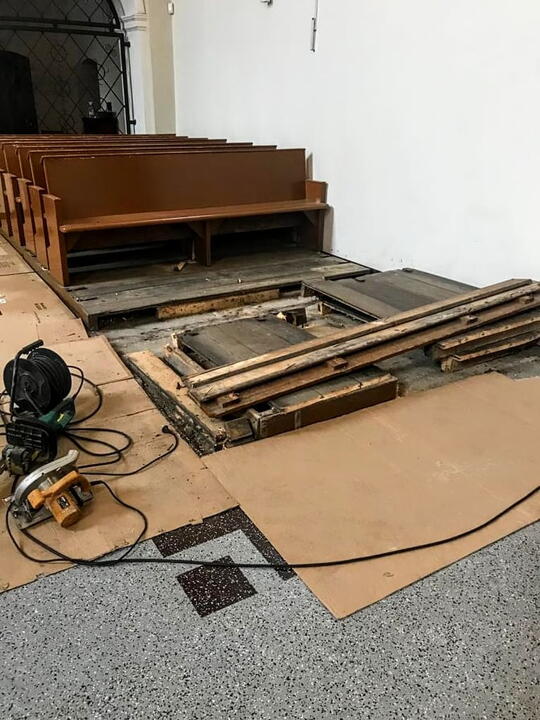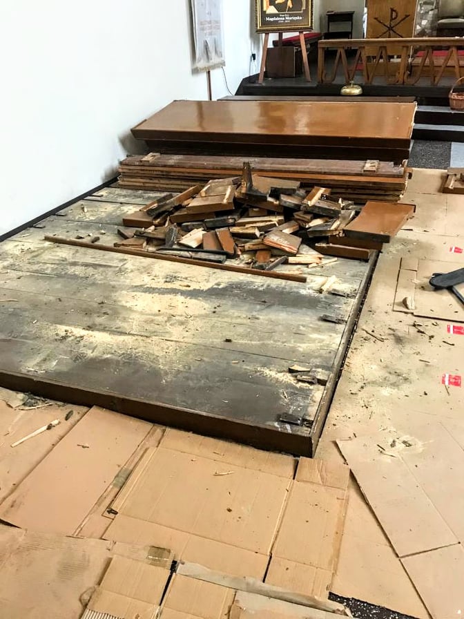 W poniedziałek 21 lutego rozpoczęły się prace przygotowawcze do wymiany ławek. Z kościoła zostaną usunięte wszystkie spróchniałe i zjedzone przez korniki ławki oraz podłoga. Po zdemontowaniu, zły stan ławek przerósł nasze oczekiwania. Okazało się, że była to ostatnia chwila na ich wymianę.