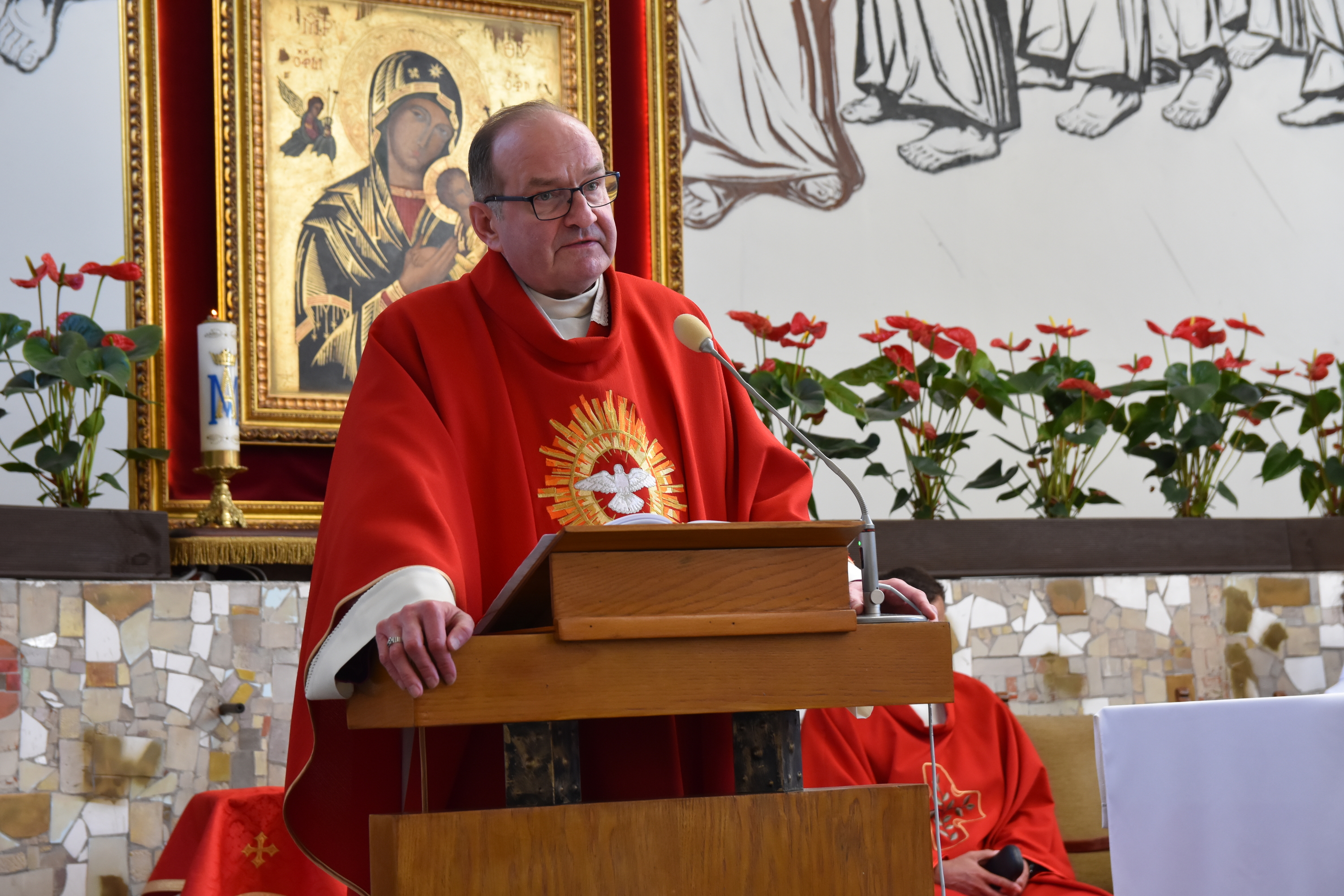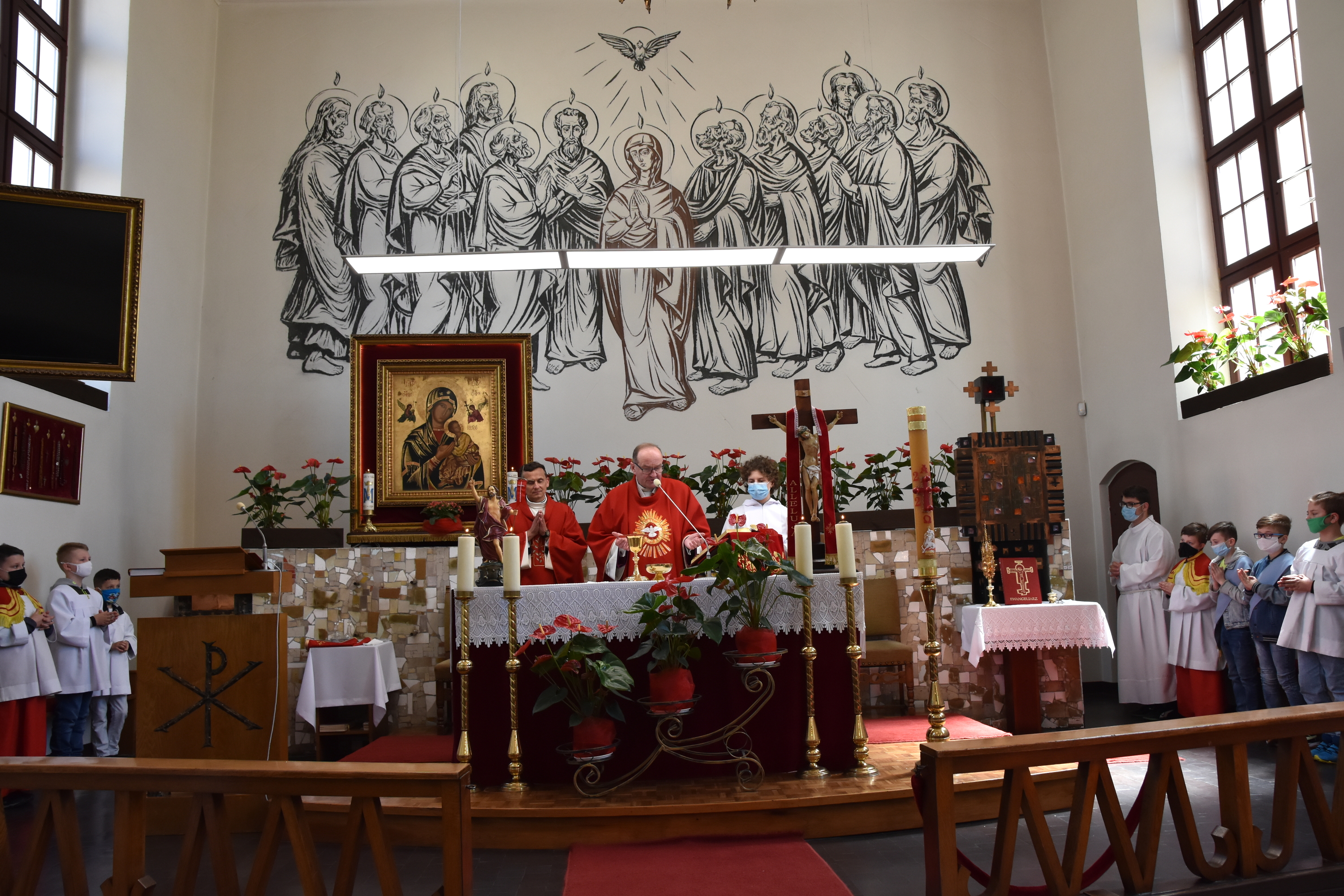 Jest to także wyjątkowy dzień dla naszej parafii, która została ustanowiona pod wezwaniem właśnie Ducha Świętego. Jest to dla nas okazja, żeby podsumować i dziękować Panu za to, czego dokonuje w naszej parafii i w każdym z nas. Uwidacznia to scena Zesłania Ducha Świętego namalowana na ścianie prezbiterium naszego kościoła. Ta okazja łączy się jednocześnie z możliwością uzyskania odpustu zupełnego, który można ofiarować za osobę zmarłą lub za siebie pod zwykłymi warunkami.