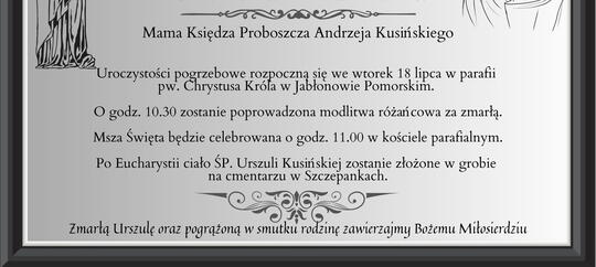 Powierzajmy Bożemu miłosierdziu śp. Urszulę Kusińską - Mamę Księdza Proboszcza.